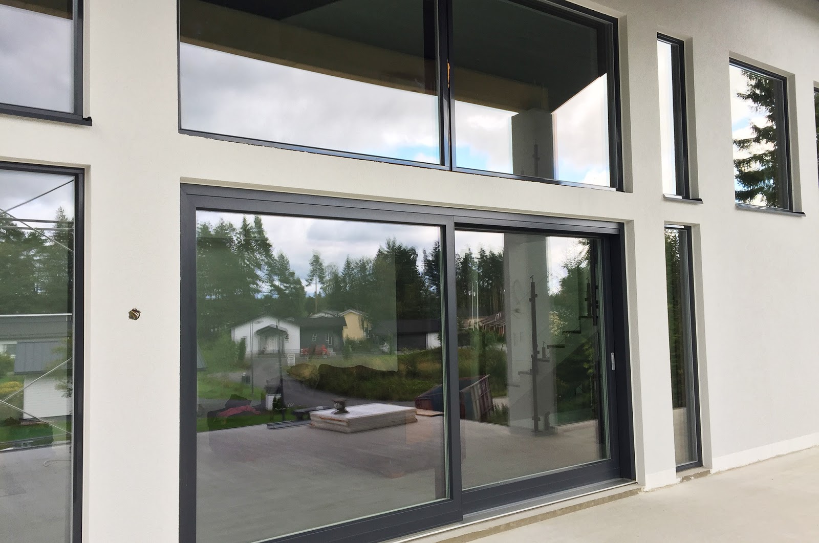 | Vähäeleiset maisemaikkunat ja liukuovet sopivat modernin kivitalon tyyliin. |